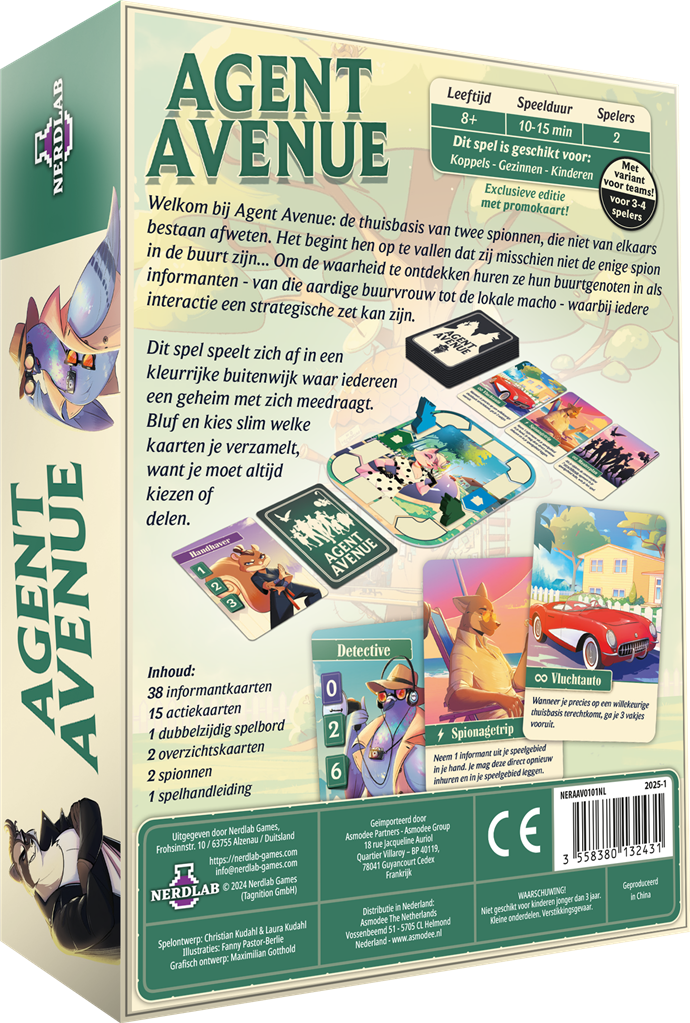 Agent Avenue is een competitief kaartspel voor 2-4 spelers dat bluffen, strategische setverzameling en een race om de identiteit van je tegenstander te ontdekken combineert. In een kleurrijke antropomorfe wereld kruipen de spelers in de huid van gepensioneerde spionnen in een buurt in de voorsteden en zijn ze elkaar te slim af met kaarten die punten kunnen opleveren of speciale effecten teweeg kunnen brengen.