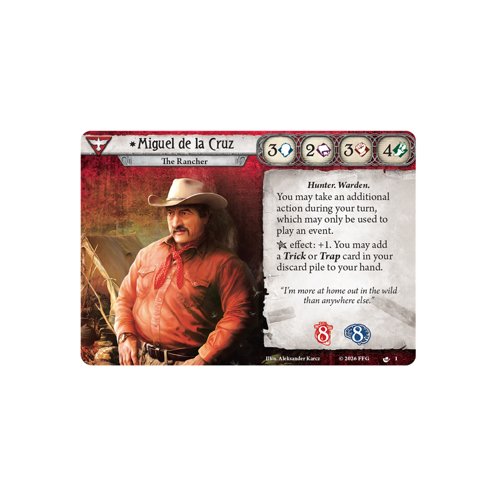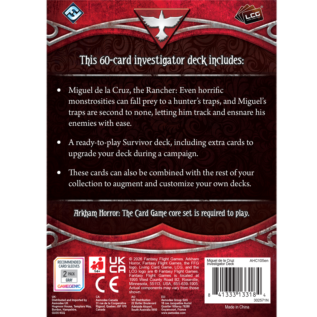 In de bossen bij Arkham schuilt meer dan alleen wilde dieren, zoals Miguel de la Cruz aan den lijve heeft ondervonden. Toch kunnen zelfs afschuwelijke monsters ten prooi vallen aan de vallen van een jager, en Miguels vallen zijn ongeëvenaard, waardoor hij zijn vijanden met gemak kan opsporen en vangen. Dit Investigator Deck voor Arkham Horror: The Card Game bevat een kant-en-klaar Survivor-deck, zodat je direct na het openen van de doos in een campagne kunt duiken. Ook inbegrepen zijn extra kaarten om het deck tijdens een campagne te upgraden.