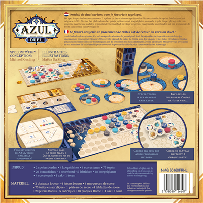 Dit spel is speciaal ontworpen voor 2 spelers en bevat nieuwe spelfuncties die meer tactische opties bieden dan het originele AZUL. Versier het plafond van het paleis in Sintra met koepelplaten en ronde tegels.