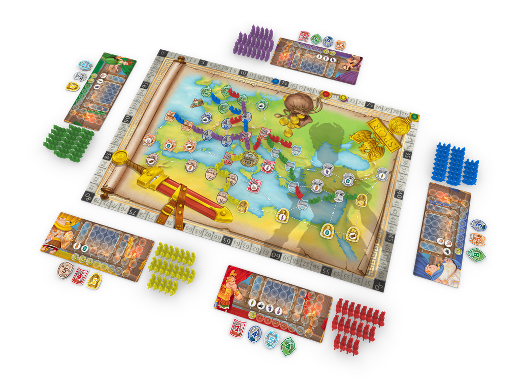Caesar’s Empire is een spel voor 2-5 spelers waar je wegen moet bouwen voor de glorie van Rome! Hoewel dit spel gebaseerd is op de geliefde stripboeken van Asterix, speel je nu niet als Galliër maar sluit je je aan bij de grote Julius Caesar! Als hoge pief in het Romeinse Rijk heb jij de taak gekregen om de grenzen van het rijk te verleggen.