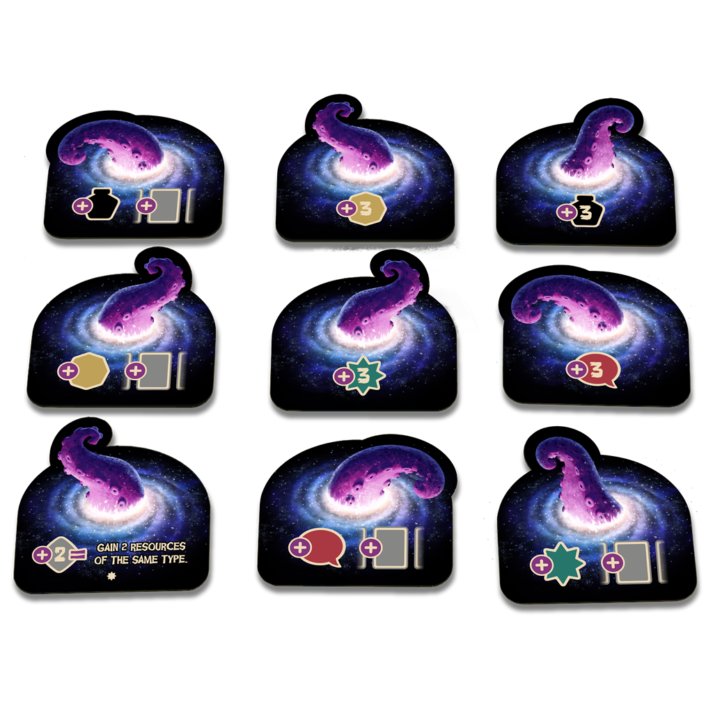 Welkom, toegewijden! De hemelse blik van de Grote Inkvis richt zich op jullie; hebben jullie wat nodig is om de meest toegewijde volgeling te zijn?Cosmoctopus is een bordspel voor het bouwen van een engine en het verzamelen van tentakels, geschikt voor 1 tot 4 toegewijden. Leid Cosmoctopus door het Inky Rijk, een flexibel opgebouwde configuratie van tegels, om middelen te verzamelen en krachtige kaarten te verkrijgen die relieken, geschriften, hallucinaties en sterrenbeelden vertegenwoordigen. Benut de kracht van deze bizarre objecten en ervaringen, creëer krachtige kaartcombinaties en wees de eerste die 8 tentakels verzamelt om te winnen! Je beurten zijn simpel; de spanning en diepgang van het spel liggen in het uitvinden hoe je het beste je steeds krachtigere hand kaarten kunt gebruiken.