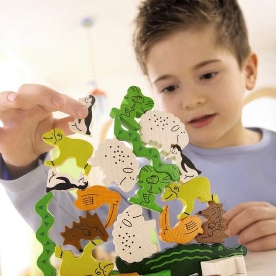 De dieren willen hun kunstje vertonen - de grote piramide! Nu moet er voorzichtig en behendig te werk worden gegaan: wie kan de pinguin op de krokodil zetten, het schaap op de pinguin en de slang op het schaap. Ook de miereneter wil bovenop de piramide klimmen en die is al zo duizelingwekkend hoog