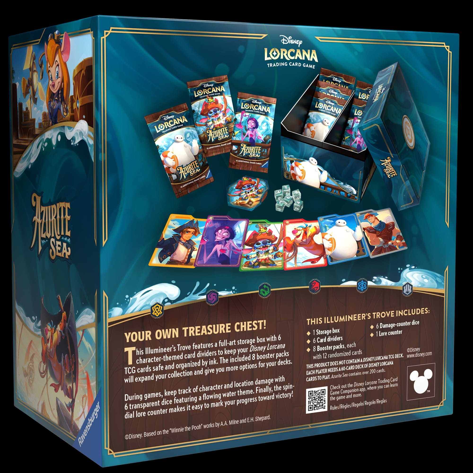 Richt je blik op de horizon! Volg een oude kaart en vaar over de prachtige maar onvoorspelbare Azurite Sea. Aan boord van deze Disney Lorcana-set met meer dan 200 kaarten, zijn vrienden van Big Hero 6 en Chip 'n' Dale: Rescue Rangers te vinden! Of je nu de Kakamora-piraten of de maalstroom van een nieuw mysterie tegenkomt, je scheepsmaten staan klaar om met de boeg voorop het avontuur in te gaan.