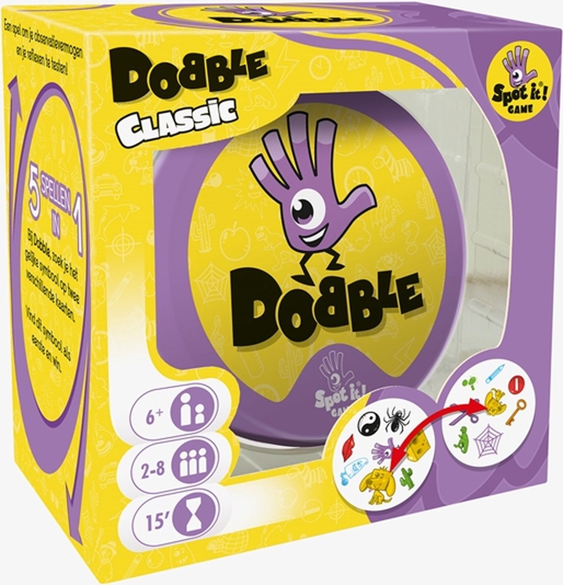 Er zijn 55 kaarten waarop steeds 8 symbolen afgebeeld staan. Je kunt vijf spelvariaties spelen met Dobble. Welke spelversie je ook speelt, je moet steeds proberen om als eerste het identieke symbool tussen twee kaarten te vinden en te benoemen. Vervolgens mag je een kaart nemen, een kaart plaatsen of een kaart afleggen volgens de regels van de verschillende mini-spelletjes die je kan spelen. Zie jij als eerste het identieke symbool?