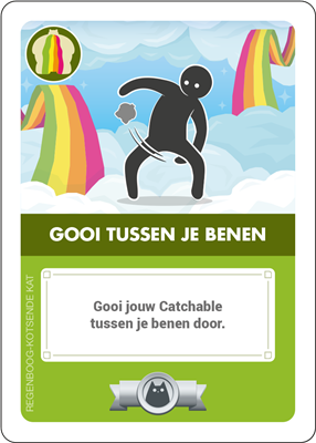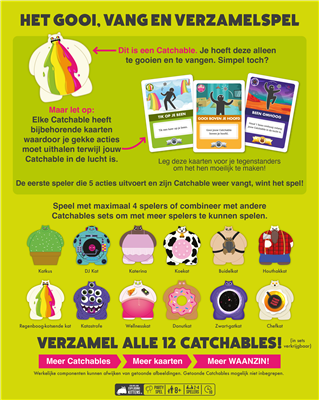 Je hoeft deze grappige Catchables alleen maar te gooien en te vangen. Simpel toch? Maar let op: elke Catchable heeft een set bijbehorende kaarten waardoor je gekke acties moet uithalen terwijl jouw Catchable in de lucht is. Leg deze kaarten voor je tegenstanders neer om het hen moeilijker te maken!