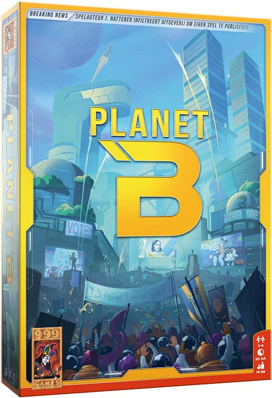 Door corruptie, winstbejag en ander menselijk falen is planeet Aarde helemaal naar de getver. Toen vonden we onze redding: een nieuwe planeet die geschikt bleek voor menselijk leven! Na een uittocht door de ruimte hebben we hier ons tweede thuis gevonden. Inmiddels zijn er jaren verstreken sinds we op Planet B zijn beland. En we hebben geleerd van onze fouten. Toch? We hebben geleerd van onze fouten, toch? Haha. Nee. De leiders van Planet B zijn nog steeds net zo op macht belust en gierig. Het is alleen de kunst om dat niet aan het publiek te laten merken. In Planet B ben je er net als je tegenspelers op uit om zoveel mogelijk winstpunten te scoren. Dit doe je door werknemers (workies) in te zetten, geldbiljetten (billies) te verdienen en verkiezingen te beïnvloeden. Kortom, zet de planeet naar je hand en ga er met de winst vandoor! Per beurt werk je samen met een onderneming, die bepaalt welke acties je kunt uitvoeren. Op gezette tijden vinden verkiezingen plaats, waarmee spelers functies zoals president, vicepresident of L.A.M.A. (Leading Authority of Mischievous Actions) kunnen bemachtigen. Keuzes die je maakt hebben invloed op je populariteit als machthebber. Nieuwskaarten laten zien wat voor gevolgen jouw acties hebben gehad en hoe de bevolking tegen je aankijkt. Het strategische spel Planet B heeft een dystopisch thema met een knipoog. Nu is jouw kans om je uit te leven als een leider van het volk of als een gladjanus van het zuiverste water. Wat heb jij voor Planet B in petto?