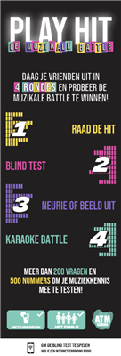 Play Hit: De Muzikale Battle is een muziekquiz met de grootste hits van toen en nu! Daag je vrienden uit in 4 rondes en probeer de muzikale battle te winnen! Speel rondes zoals 'Raad de Hit', 'Blind Test', 'Neurie of Beeld Uit' en 'Karaoke'.