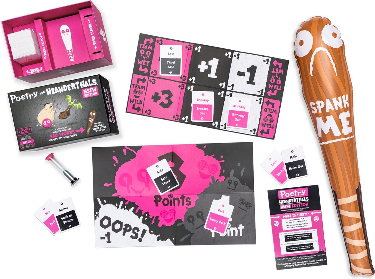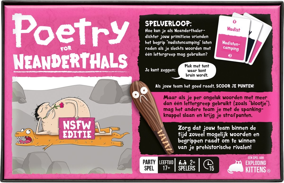 Poetry for Neanderthals is een geweldig partyspel geschikt voor de hele familie. Spelers verdienen punten door als dichtende Neanderthalers hun teamgenoten woorden en begrippen te laten raden. Maar let op: als Neanderthaler ken je alleen woorden met 1 lettergreep... Gebruik je woorden met meer dan 1 lettergreep, dan krijg je van het andere team een klap met de opblaasbare knuppel! Het team met de meeste punten wint!