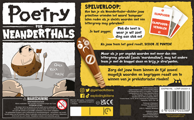 Poetry for Neanderthals is een geweldig partyspel geschikt voor de hele familie. Spelers verdienen punten door als dichtende Neanderthalers hun teamgenoten woorden en begrippen te laten raden. Maar let op: als Neanderthaler ken je alleen woorden met 1 lettergreep... Gebruik je woorden met meer dan 1 lettergreep, dan krijg je van het andere team een klap met de opblaasbare knuppel! Het team met de meeste punten wint!
