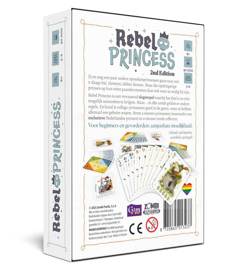 Rebel Princess is een verrassend slagenspel waarbij het doel is zo min mogelijk aanzoeken te krijgen. Maar… in elke ronde gelden er andere regels. En houd je collega-prinsessen goed in de gaten, want ze hebben allemaal een geheim wapen. Bevat 4 nieuwe prinsessen (waaronder een exclusieve Nederlandse prinses) en 6 nieuwe ronde-effecten.