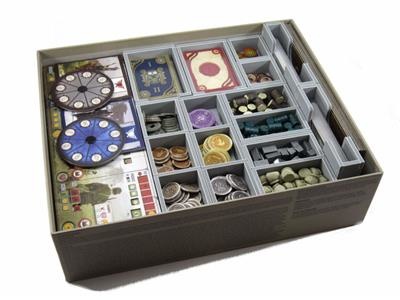 Er zijn zeven spelerstrays, met aparte vakjes voor de miniaturen en de spelerstokens. De achtste lade is voor de gevechtskaarten en bonustegels in de ene gleuf en de andere fiches in de andere gleuf. De gevechtskaarten kunnen allemaal worden gesleeved.