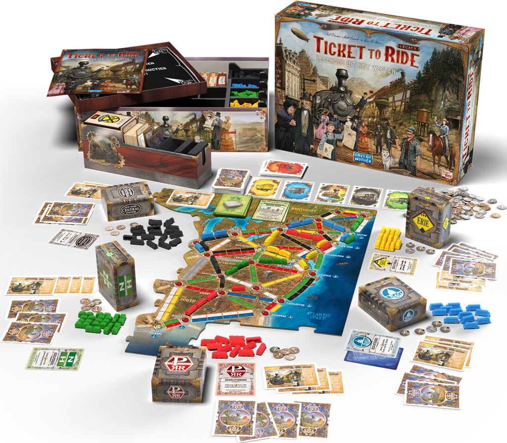 Ticket to Ride Legacy: Legendes uit het Westen geeft jou de kans om aan boord te stappen van jouw favoriete treinspel en de verbeelding van Rob Daviau, Matt Leacock en Alan R. Moon te beleven. Je maakt een reis van twaalf spellen, waarin je jouw Noord-Amerikaanse spoorwegmaatschappij naar rijkdom en fortuin leidt via een campagne vol avonturen.