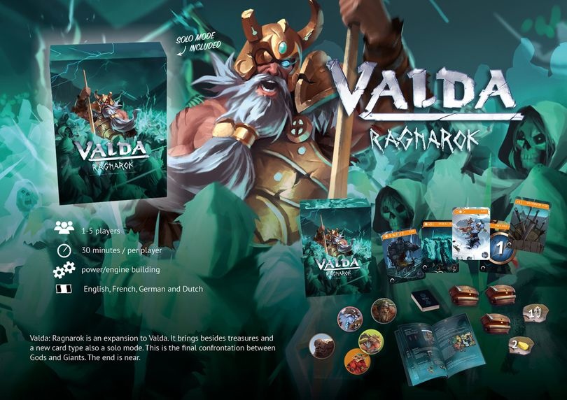 Valda: Ragnarok is een uitbreiding voor Valda. Het introduceert naast schatten en een nieuw kaarttype ook een heuse solo-modus. Ragnarok brengt de finale confrontatie tussen Reuzen en Goden. Goddelijk bloed zal vloeien, Goden zullen sterven, rijken zullen verbrokkelen en Reuzen zullen vallen.. Het einde is nabij.