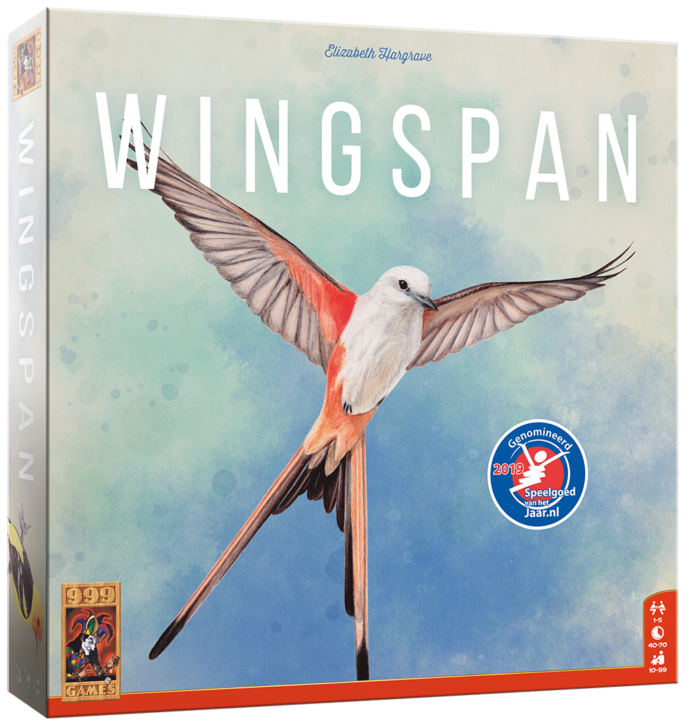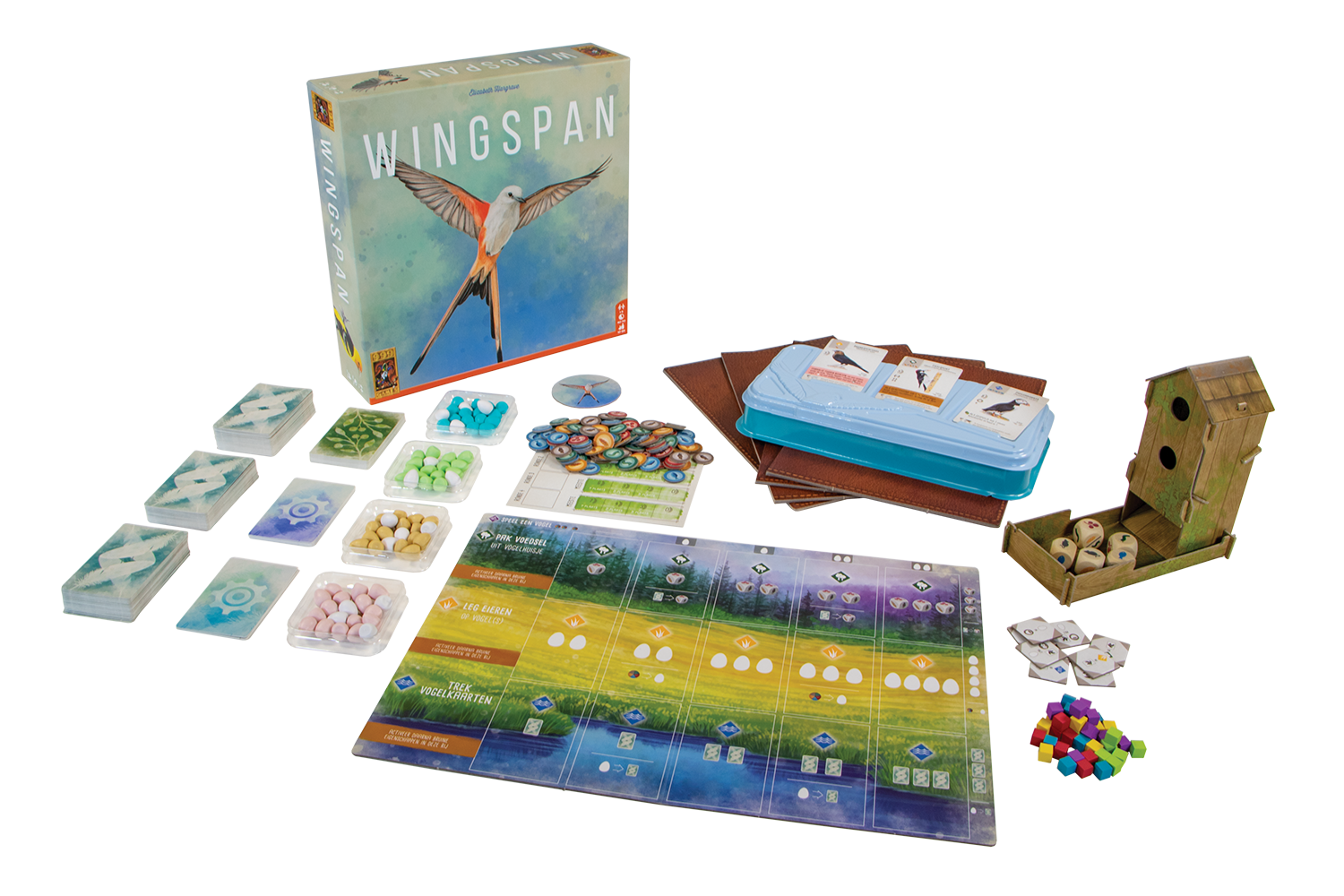 Een vogelspel vol tactiek en spanning! Als vogelliefhebber zet je vogels uit in jouw persoonlijke natuurgebied. Elke vogel komt in een van drie soorten natuuromgeving terecht: bos, weide of moeras. Daar gaan de vogels voor je aan de slag. Zo wordt in het bos voedsel verzameld, terwijl de weide ervoor zorgt dat er eieren worden gelegd en het moeras je meer vogelkaarten geeft. Door je vogels slim met elkaar samen te laten werken, behaal je het meeste voordeel. Dankzij tactische combinaties scoor je zo meer eieren, kaarten of voedsel dan je tegenspelers. Er zijn dan ook een groot aantal manieren om punten te verzamelen. Wie na vier rondes de meeste punten heeft verzameld, wint het spel. Het spel bevat 170 unieke vogelkaarten, die in combinatie met de verschillende bonuskaarten voor oneindige variatie zorgen. Ook heeft Wingspan fraai speelmateriaal, in de vorm van onder andere het vogelhuisje voor de dobbelstenen en de plastic eieren. Wingspan komt verder compleet met een speciale automa-variant voor solospelers.